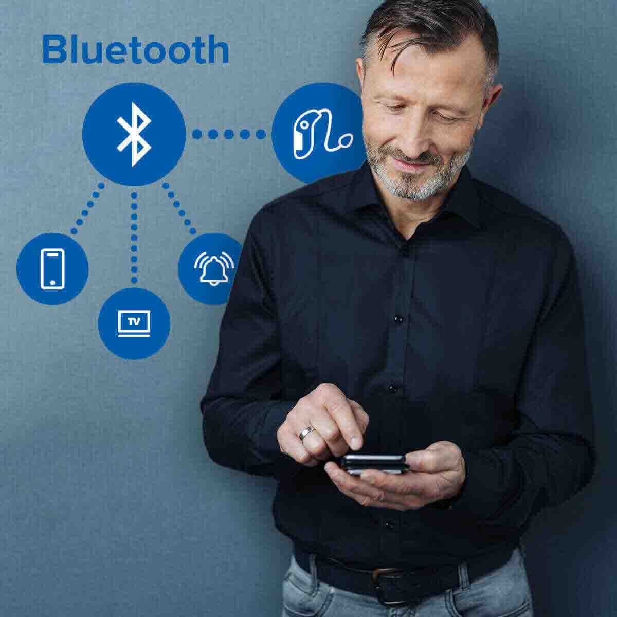 stream music and other audio from your cell phone, tablet or computer. Photo courtesy: Oticon With Bluetooth, you can take phone calls using your hearing aids as earpieces.This includes video calls like Skype and FaceTime. You can also listen to movies and music through your Bluetooth hearing aids. You can even connect your hearing aids to your doorbell so you never miss a visit. Remote control of your hearing aidsMost Bluetooth hearing aids come with apps you can use to control your hearing aids. Apps like Oticon RemoteCare or myPhonak help you perform essential tasks. You can adjust the volume on your hearing aids and change the pre-set programs without needing to touch your hearing aids. They can also help your hearing professional access and program your hearing aids remotely. Speak to your audiologist or hearing specialist for more on these apps and features. Location servicesBoth iOs and Android support apps to help you locate your hearing aids if you lose them. The app uses the established Bluetooth connection to locate your hearing aids nearby. Other ways you can use BluetoothMany manufacturers offer separate streamers that can connect to your Bluetooth hearing aids. With a small box connected to your television, you can stream audio from your TV to your hearing aids. This is a great solution for those who have difficulty hearing the TV, even with hearing aids. It also helps family members bothered by the high volume of the TV. With Bluetooth technology, you can also use a streamer or phone as a microphone. When the person wears it, the microphone will amplify his or her voice over other sounds around you. Will it drain my battery?The added ability of Bluetooth hearing aids can put a strain on the hearing aid battery. Hearing aids with low-energy (LE) Bluetooth technology solve much of this. They produce higher quality sound with less energy. However, if you plan to use Bluetooth a lot, talk to your hearing care provider about how to avoid battery drain. How does Bluetooth work?